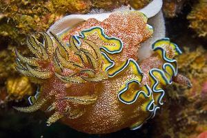 Diese Art hat einen Blei- stift dicken , lang- gestreckten Körper der mit vielen Mantelauswüchsen bedeckt ist. Auf einer Riffwand in 18m Tiefe ge- lang dieses Foto aus 25 cm Abstand.