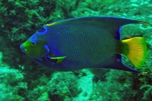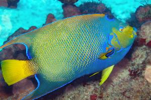 Bei dieser Färbung eines Königin- Kaiserfisches handelt es sich um ein Alttier. Die Art ernährt sich hauptsächlich von Schwämmen und Korallen. Der Königin- Kaiserfisch kommt häufig in der Karibik vor. Das Foto konnte in 35m Tiefe aus einem Abstand von 1m gemacht werden.