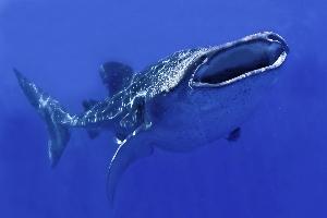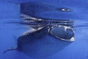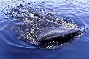 Walhaie erreichen erst im Alter von 10 bis 15 Jahren ihre Geschlechtsreife. Die Tiere können ein Alter von 100 Jahren erreichen. Das Foto wurde in 1m Tiefe und 3m Abstand gemacht und zeigt den Walhai bei der Nahrungsaufnahme.