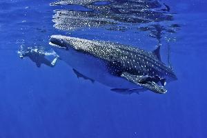 Mit einer Dicke von 15 cm haben Walhaie die dickste Haut aller Lebewesen der Erde. Erst 1995 wurde festgestellt das Walhaie lebende Junge gebären. Aus einem Abstand von 3m an der Wasser- oberfläche gelang dieses Foto.