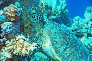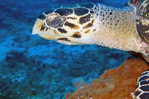 Meeresschildkröten leben in allen tropischen Meeren der Erde. Sie haben Lungen und können mit einem Atemzug bis zu 5 Stunden Unterwasser bleiben. Die Tiefe bei diesem Foto betrug 30m und es wurde aus 80cm Abstand gemacht.