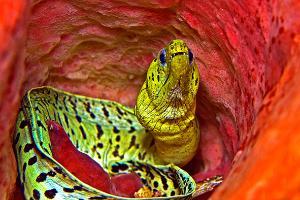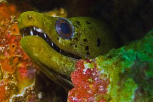Grüne Muränen sind Einzelgänger und verbringen den Tag meist in Höhlen. In der Nacht gehen sie auf Jagd nach Fischen,Sepien und Krebsen. Aus 80 cm Entfernung und in einer Tiefe von 18m wurde dieses Foto gemacht.