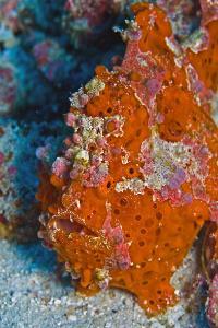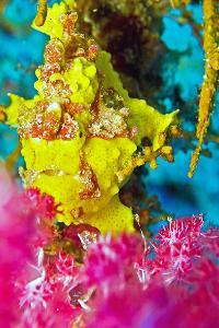 Anglerfische sind gut getarnt und sehen manchmal aus wie ein bewachsener Stein. Sie sind Standort treu, liegen auf dem Untergrund und lauern auf Beute. Sie können sich mit den Brustflossen wie mit Füßen auf dem Boden bewegen. In 20m Tiefe wurde das Foto aus 25 cm Entfernung gemacht.