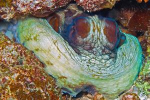 Ein Octopus hat acht Arme mit je zwei Reihen Saug- näpfen. In der Mantel- höhle liegen die Atmungs- organe. Er hat ein hoch- entwickeltes Gehirn und Nervensystem. In 18m Tiefe und aus 50 cm Ent- fernung gelang dieses Foto.