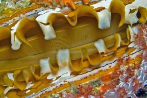 Das Foto zeigt zwei in- einander verschlungene Tiere. Hierbei dürfte es sich um eine Kopulation handeln. An einer Wrack- wand kam es in 30m Tiefe und aus 30cm Abstand zu dieser Aufnahme.