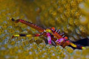 Diese Krabben leben paar- weise in Steinkorallen. Über ihre Vermehrung sind keine Einzelheiten bekannt. In 27m Tiefe und aus 25cm Abstand entstand dieses Foto.