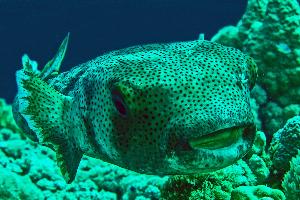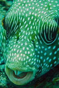 Kugelfische können sich bei Gefahr mit Wasser füllen und zu einer großen Kugel aufpumpen. In nur 8m und aus 50 cm Entfernung entstand dieses Foto.