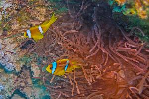 In einer rotbraunen Anemone lebten diese Anemonenfische. Da die Anemone stark nesselt und eine Gefahr für andere Fische darstellt verstecken sich die Anemonenfische in ihr. Den Anemonenfischen macht das Nesselgift nichts aus. In 12m Tiefe und aus 1m Abstand kam es zu diesem Foto.