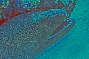 Muränen besitzen ein gut entwickeltes Geruchs- organ. Damit finden sie Nachts ihre Beute. Diese Art hat in der Mitte des Kiefers eine dritte Zahn- reihe. Das Foto wurde in 20m Tiefe und aus 30cm Abstand gemacht.