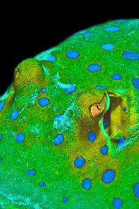 Das Foto zeigt Augen und Kiemen eines Blaupunktrochens. Die Tiere sind im Roten Meer stark verbreitet. Bei einem Nachttauchgang am Hausriff entstand die Aufnahme in 20 m Tiefe und aus 30 cm Entfernung.