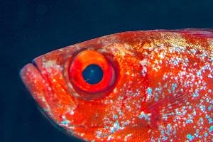 Soldatenfische erreichen eine Körper- länge von ca. 30 cm. Sie gehören zur Familie der Strahlenflosser. Sie sind überwiegend rötlich gefärbt und werden erst Nachts richtig aktiv. Bei einem Nachttauchgang am Hausriff gelang die Aufnahme in 22m Tiefe und aus 50cm Entfernung.