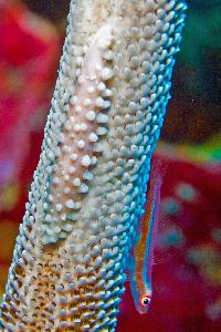 Beide Tiere leben fest auf einer Peitschenkoralle. Bei der Spindel- kaurie handelt es sich um eine Nacktschnecke die sich genau der Farbe und Form der Koralle angepasst hat. Sie war bislang nur vor Japan bekannt. Jetzt aber wurde sie auch schon einigemale in der Andamanensee nachgewiesen. Der Blenny schwimmt, immer im festen Kontakt mit seiner Koralle wie auf einer Autobahn. In einer Tiefe von 32m gelang diese Aufnahme aus 25 cm Abstand.