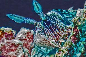 Feuerfische tragen auf ihrem Rücken giftige Stacheln und sind gefräßige Räuber. Auf einer Tiefe von 25m und mit 50 cm Abstand gelang dieses Foto.