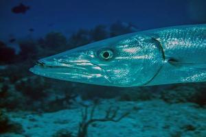 Barrakudas ernähren sich von Fischen die sie im Freiwasser jagen. Sie ent- wickeln bei der Jagd eine große Geschwindigkeit. Da sie am Ende der Nahrungskette stehen, reichert sich in ihnen das giftige Ciguatoxin an.Aus einem Abstand von 2m und in einer Tiefe von 22m kam es zu diesem Foto.