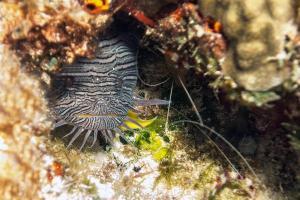 Das Palancar-Reef ist ein Naturschutz- gebiet. Hier werden Langusten extrem groß. Adulte Karibik-Langusten leben im Korallenriff unter Felsen und in Spalten. Sie wachsen im Jahr im Mittel 5 cm, dabei häuten sie sich zweimal im Jahr. Das Foto wurde in 15m Tiefe und mit 50 cm Abstand gemacht.